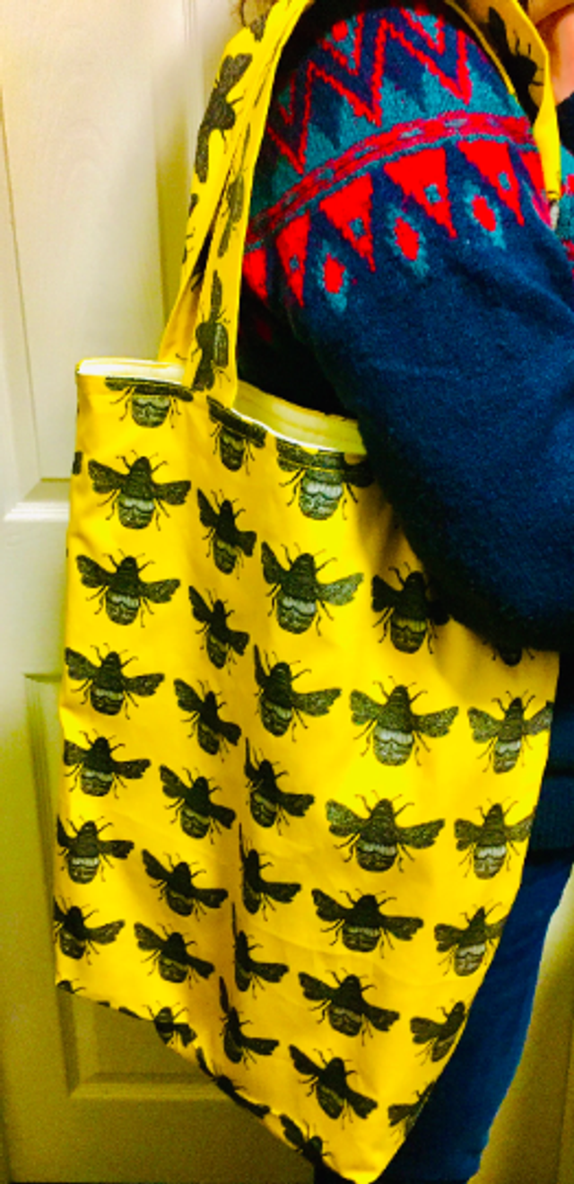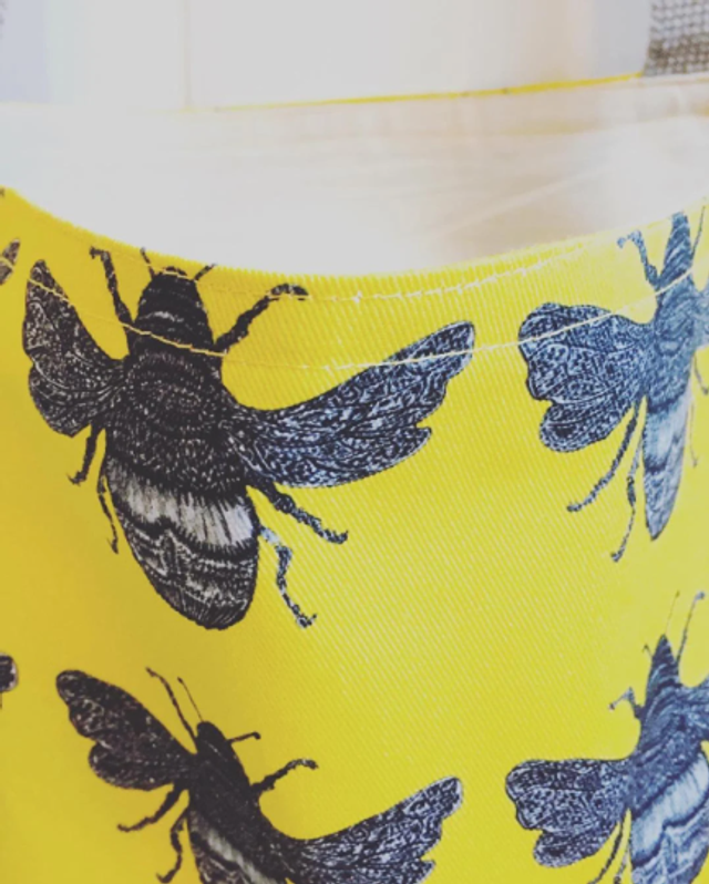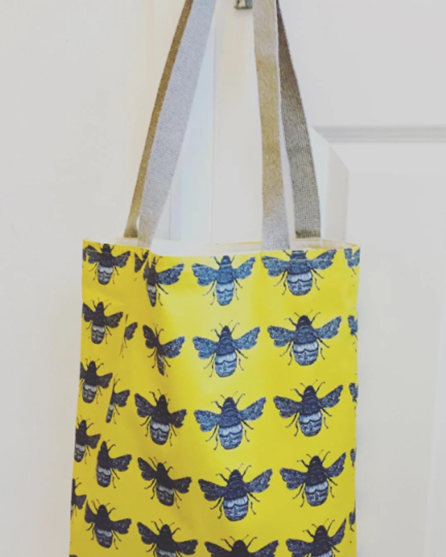 Handmade Organic cotton canvas 213 gsm lined tote bag in the original Bee Happy design from Ink sketched drawings. Finished with woven webbing in taupe or fabric Handles