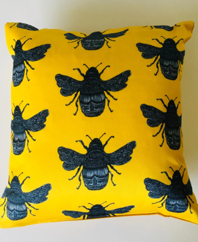 Brighten your space with this lovely Bee Happy Cushion, Ink sketched by myself applied by printing to 156 gsm silky poly-cotton with a British made feather insert pad, all handmade.