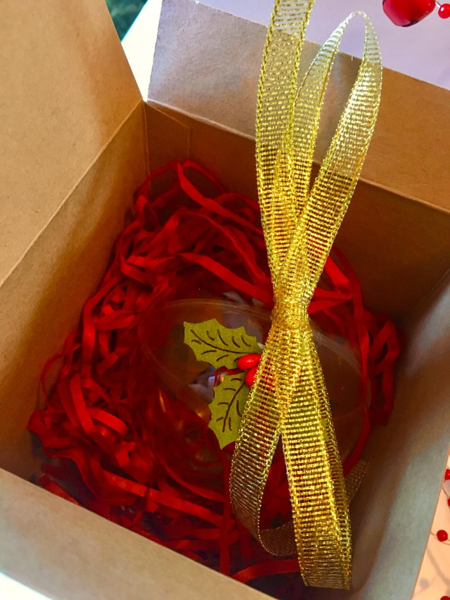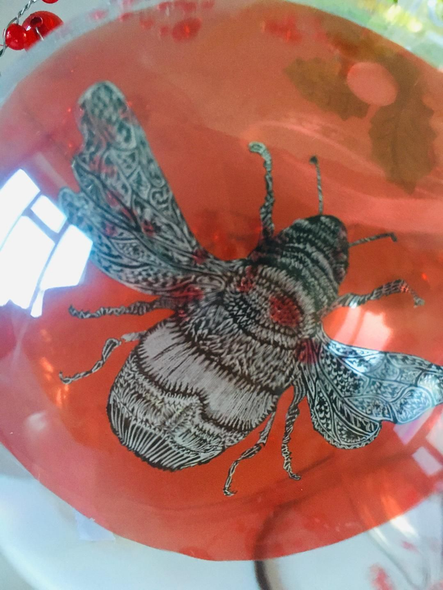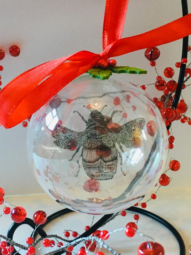 Merry Bee Christmas Bauble in Acrylic with Loudle design's Ink sketched Bee printed onto a coloured Hand cut acetate circular disc to give a stained glass effect, trimmed with assorted ribbon and a sprig of Christmas Holly to decorate. Baubles come in a brown sustainable gift box.