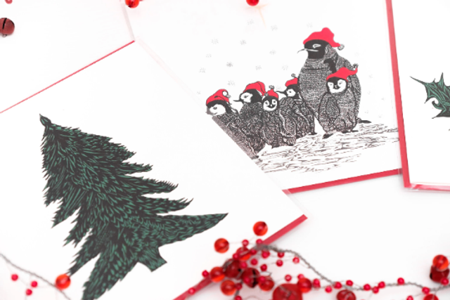 Santa's little helpers, Christmas Tree, and Holly Greeting cards.
