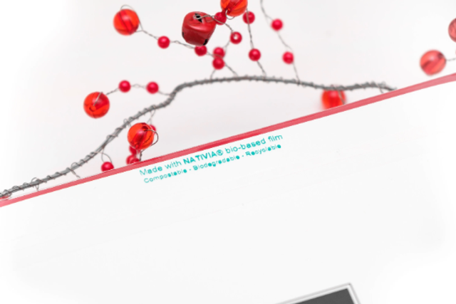 Nativia biobased compostable and recyclable sleeve with a Crimson-coloured envelope.