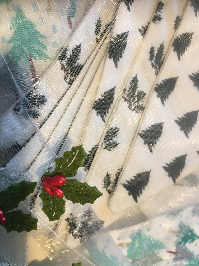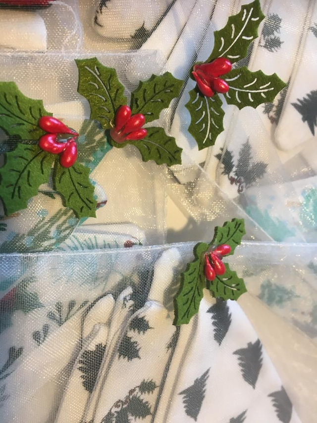Handmade Christmas Tree and Holly design Bunting double-sided with plain fabric on the backing, The Trees and Holly are added from my own sketches and printed onto Organic cotton , 2 metres in length and 9 flags in total, and with a White organza bag.