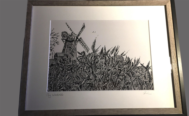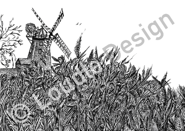 Cley Windmill Norfolk Ink Sketched Print Mounted or Framed