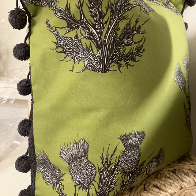 Moorland cushion with pad, handmade and designed from a Loudle sketch onto organic cotton and finished with Pom poms.