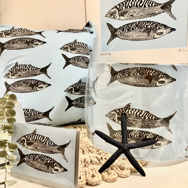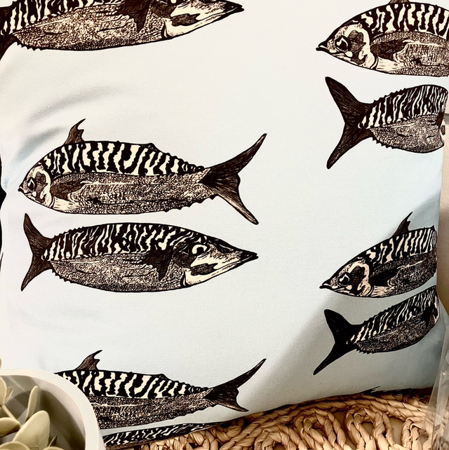 Silver Darlings Cushion with pad. Handmade from a Loudle sketch printed onto organic cotton 16 x 16 inches .